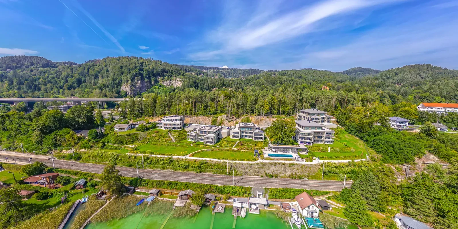 Tauchen Sie ein in die Sonnenseite des Lebens, eingebettet in einem 15.000 m² großen, parkähnlichen Areal am Nordufer des Wörthersees. Zwischen dem idyllischen Pörtschach und dem pulsierenden Hotspot Velden entstanden am Ende eines Privatweges in einer traumhaften Neubauanlage fünf Seevillen.