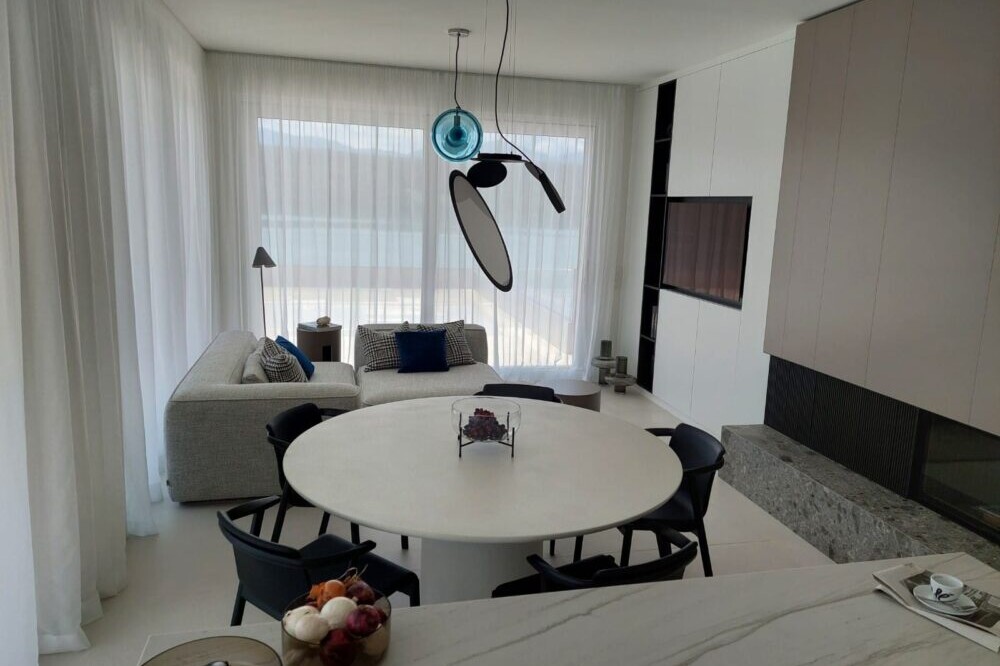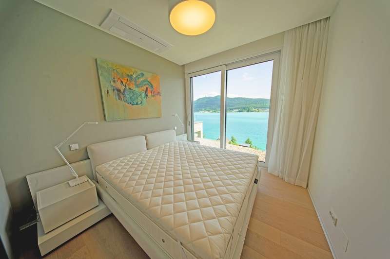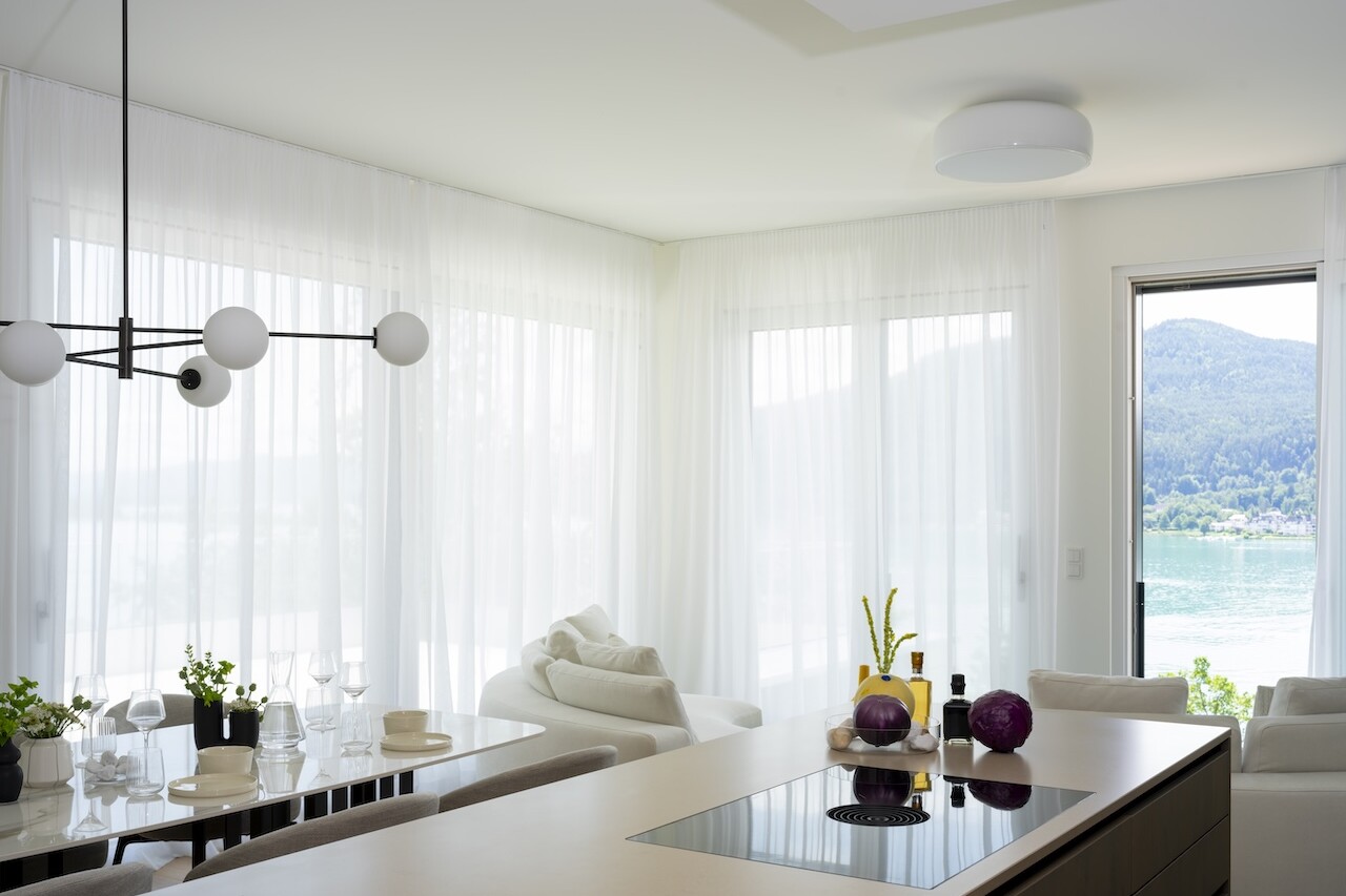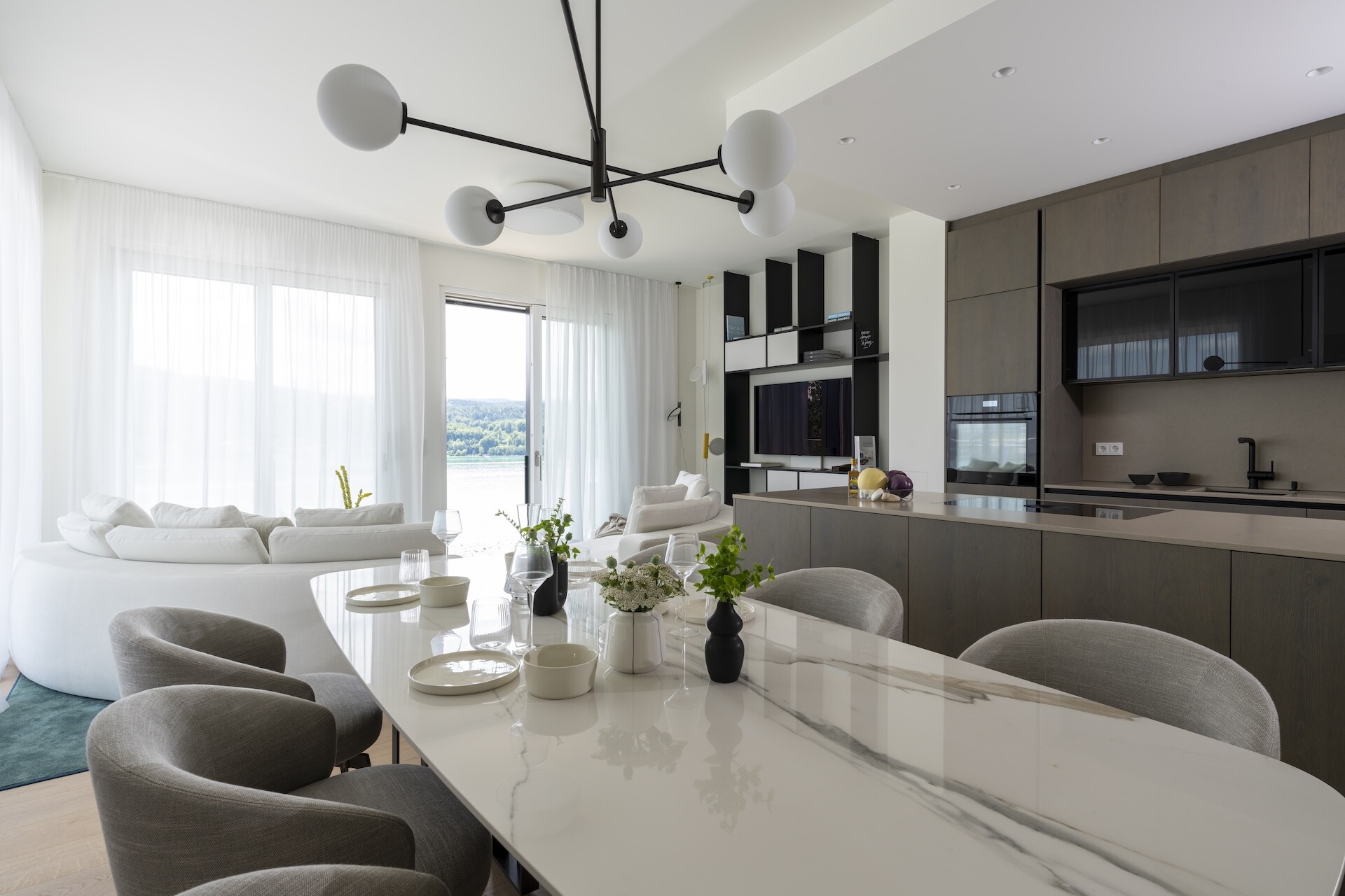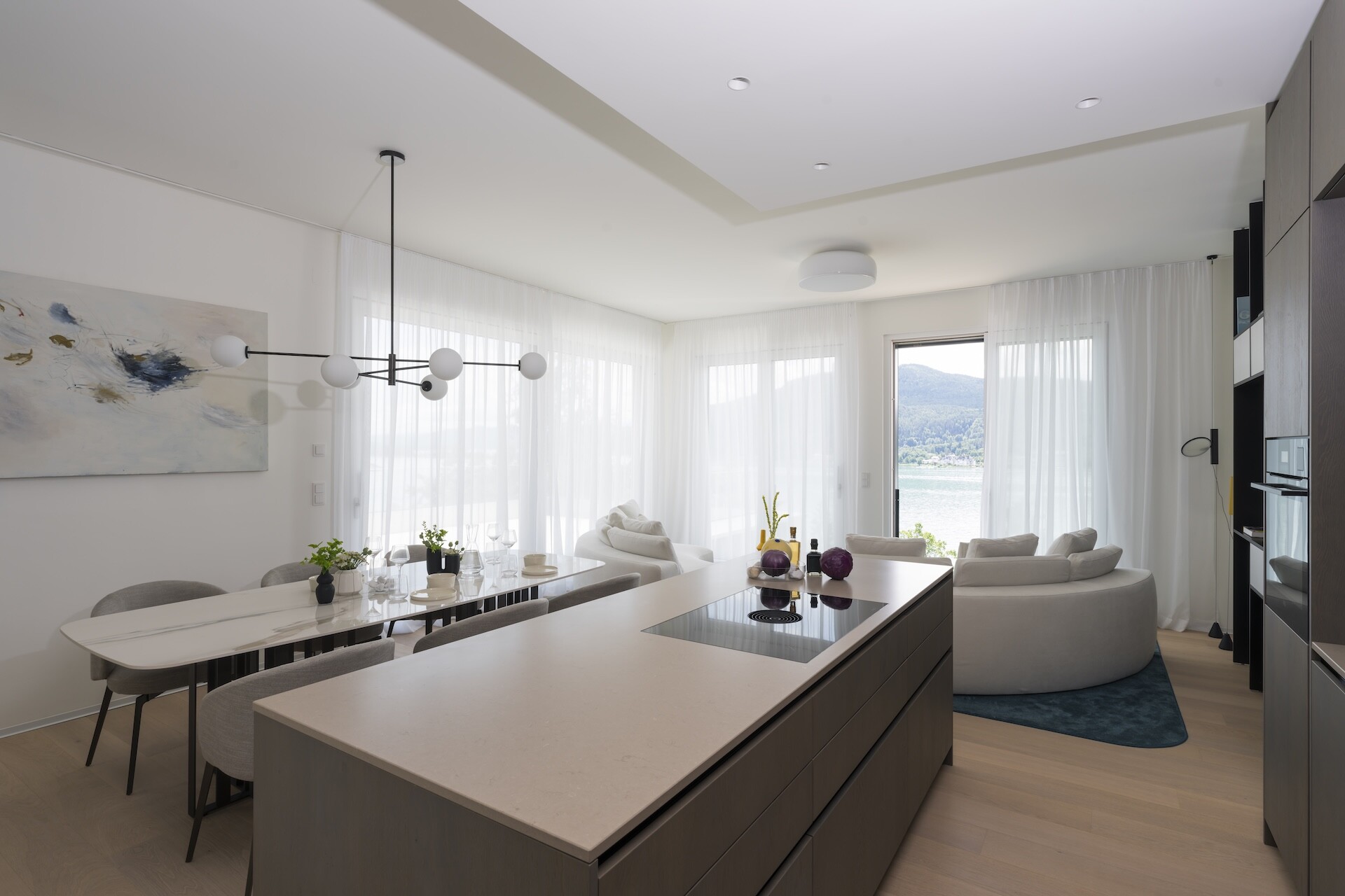 Erleben Sie luxuriösen Wohnkomfort in einer stilvoll gestalteten 4-Zimmer-Wohnung mit traumhaftem Blick auf den Wörthersee. Die hochwertige Einrichtung und die edlen Designermöbel schaffen eine elegante Atmosphäre, in der sich Wohnen und Wohlfühlen vereinen.