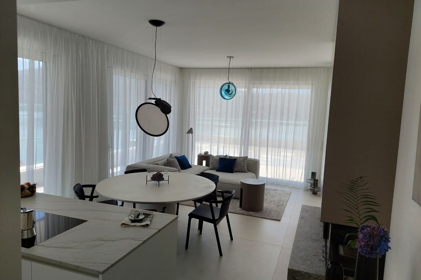 3-Zimmer-Penthouse mit großzügiger Terrasse: Offener Wohn- und Essbereich mit hochwertiger Küche, viel Platz und stilvollen Details. Hauptschlafzimmer mit eigenem Bad en-Suite. Zusätzliches Schlafzimmer und ein weiteres Badezimmer. Großzügige Terrasse mit Seeblick, hochwertige Oberflächen, Designer-Möbeloptionen und stimmungsvolle Beleuchtung. Viel Tageslicht durch große Fensterfronten.