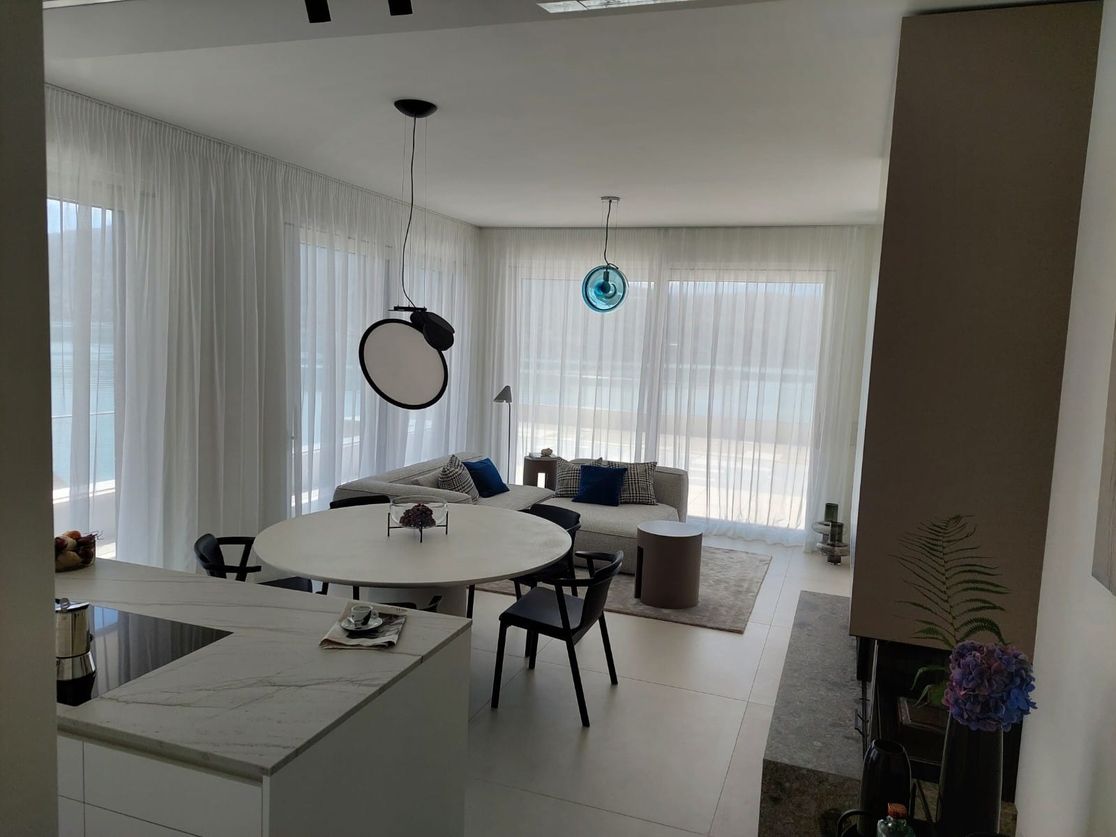 3-Zimmer-Penthouse mit großzügiger Terrasse: Offener Wohn- und Essbereich mit hochwertiger Küche, viel Platz und stilvollen Details. Hauptschlafzimmer mit eigenem Bad en-Suite. Zusätzliches Schlafzimmer und ein weiteres Badezimmer. Großzügige Terrasse mit Seeblick, hochwertige Oberflächen, Designer-Möbeloptionen und stimmungsvolle Beleuchtung. Viel Tageslicht durch große Fensterfronten.