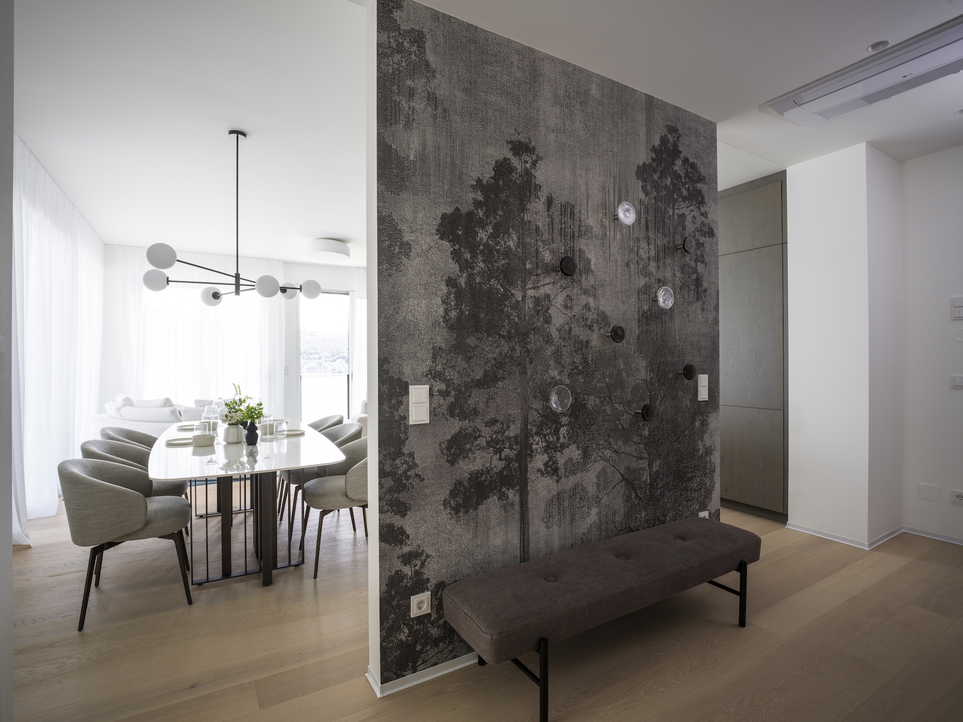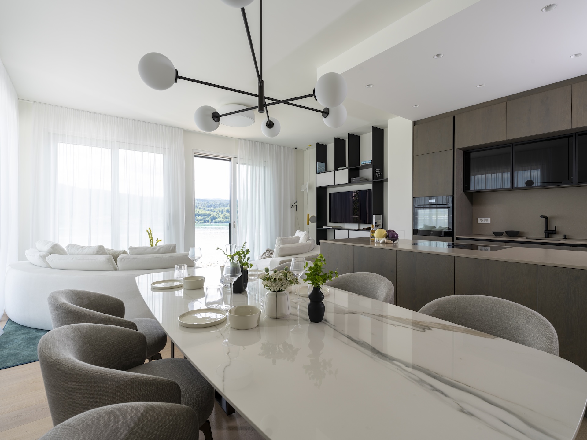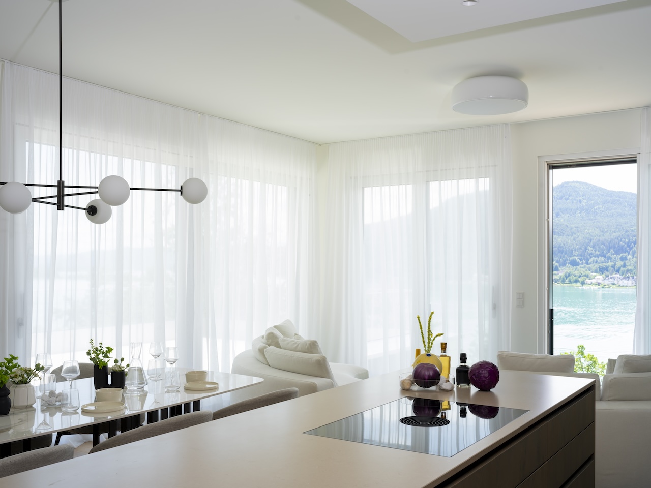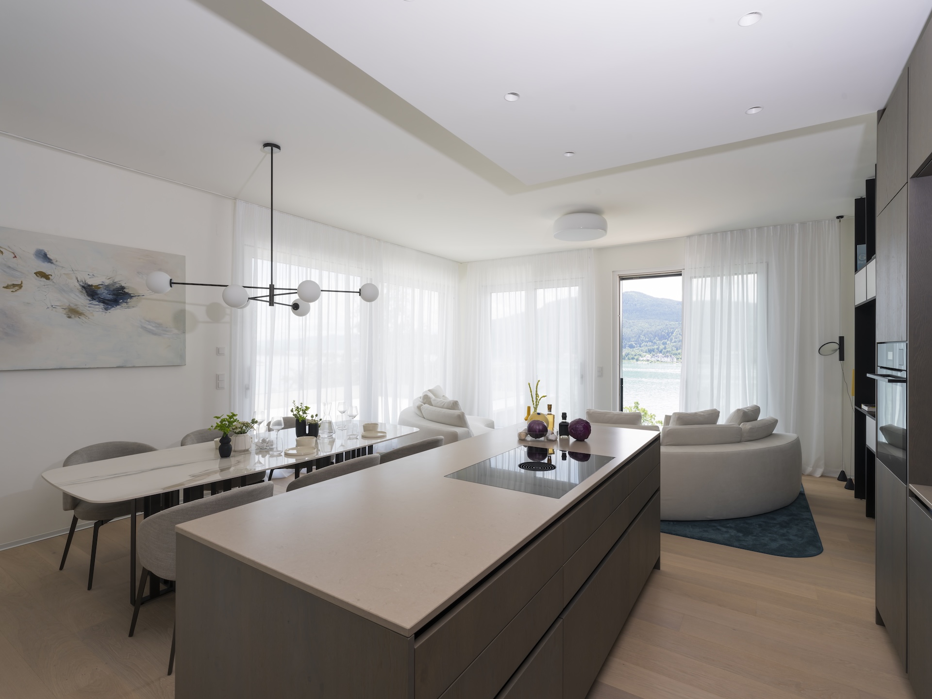 Erleben Sie luxuriösen Wohnkomfort in einer stilvoll gestalteten 4-Zimmer-Wohnung mit traumhaftem Blick auf den Wörthersee. Die hochwertige Einrichtung und die edlen Designermöbel schaffen eine elegante Atmosphäre, in der sich Wohnen und Wohlfühlen vereinen.